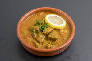 Agneau prepare das une sauce speciale avec des tomates et de l’ail.