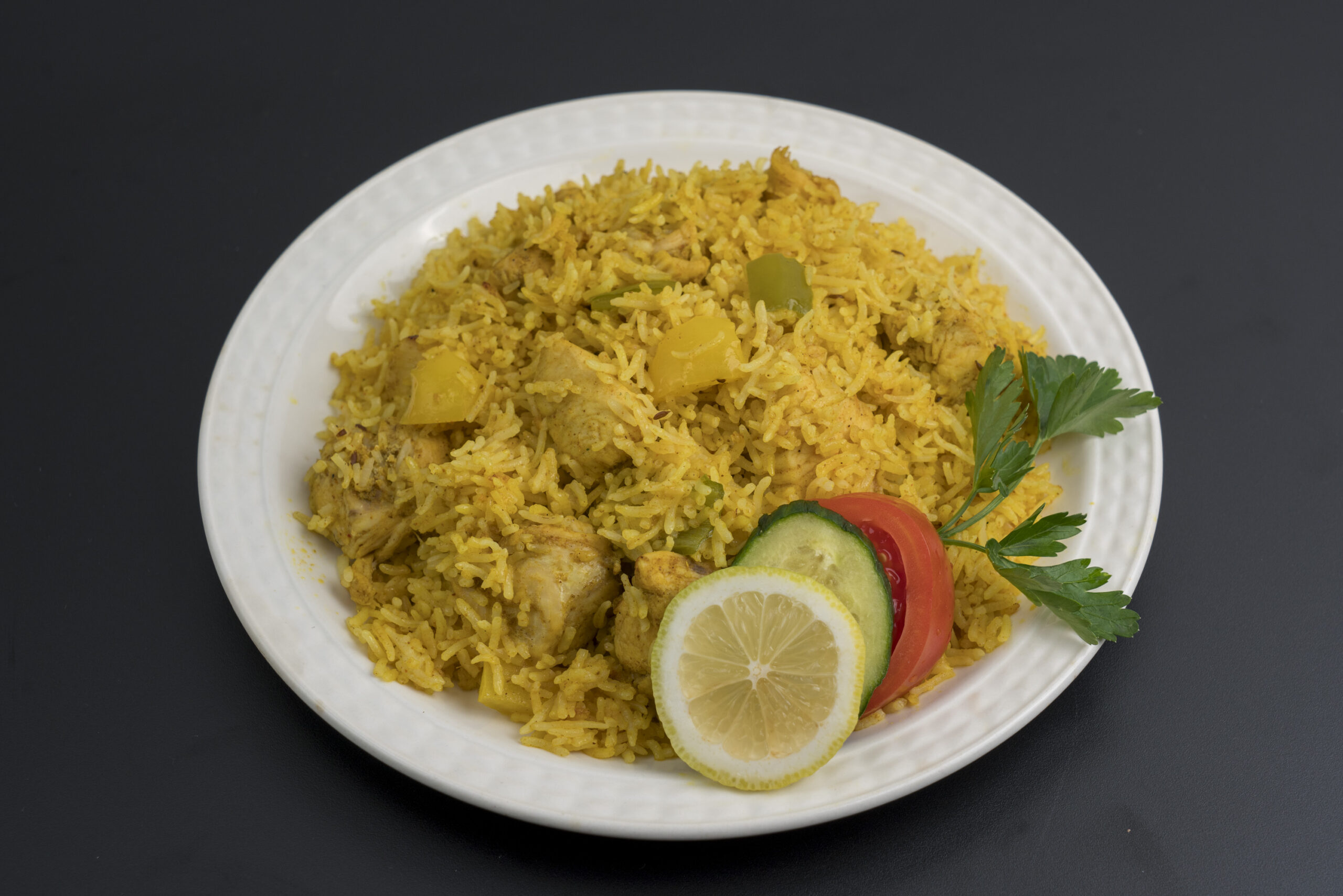 Riz sauté aux légumes ou des viande frais, épices, raisins secs, servi avec curry de légumes.