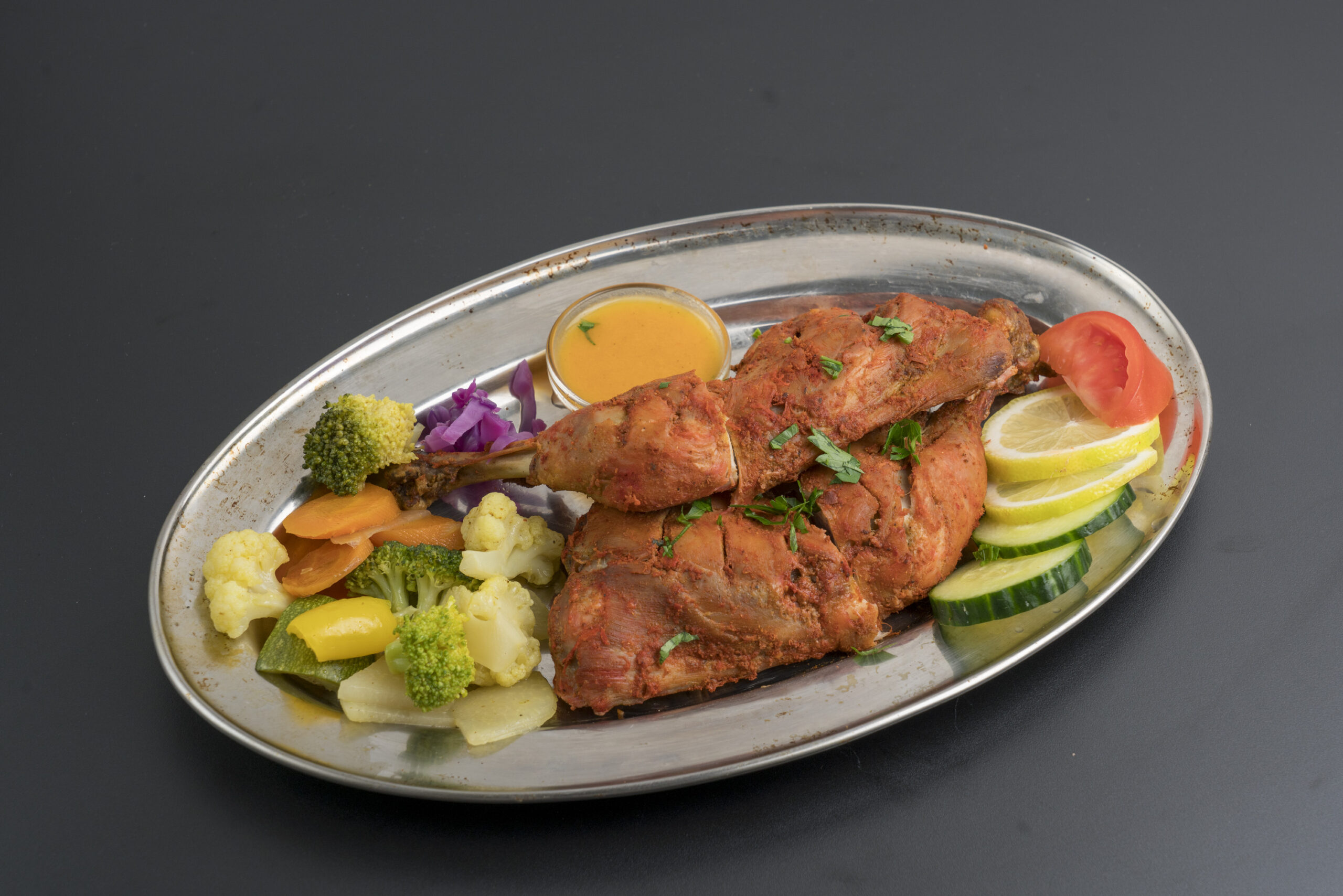 Cuisses de poulet marinées dans du yahourt et des épices indiennes,cuites dans le four ,servies avec une sauce aux légumes.