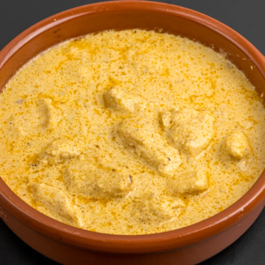 Poulet (halal) doux à la crème, yaourt, noix de coco et raisins secs.